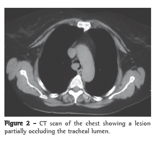 We decided to investigate concomitant conditions that might be responsible for the worsening of the clinical profile. A CT scan of the chest showed a vegetative lesion of the trachea, located 1.0 cm from the carina, resulting in significant luminal narrowing (Figure 2). Fiberoptic bronchoscopy revealed a violaceous endobronchial lesion, with well-defined borders and a smooth surface, lodged in the right wall of the trachea and obstructing 90% of the lumen. No biopsy was performed.