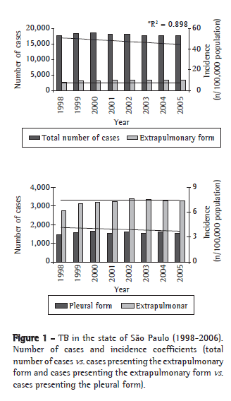 cases of TB were reported in the state of São Paulo. In this eight-year period, the incidence trend suffered a decline (49.7, 50.3, 50.4, 48.3, 47.7, 46.0, 45.0 and 44.6%, respectively; R2 = 0.898; p < 0.001). The pulmonary form predominated (118,575 cases; 82.2%), and, among the extrapulmonary forms (25,773 cases; 17.8%), pleural TB was the form most often reported (12,545 cases; 48.7%). The incidence of pleural TB did not vary significantly (4.1, 4.3, 4.8, 4.1, 4.2, 4.0, 4.1 and 3.8%, respectively, from 1998 to 2005; R2 = 0.433; p = 0.076; Figure 1).