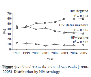 In Brazil, the greatest number of TB cases (20%) is found in the state of São Paulo, and information about the epidemiological profile of the various clinical expressions of the disease is scarce. Chief among the extrapulmonary forms, which account for 15% of the total number of cases in Brazil, is pleural TB.(2-4) However, in the presence of TB/HIV coinfection, the proportion of extrapulmonary cases reaches 20%.(5,6)