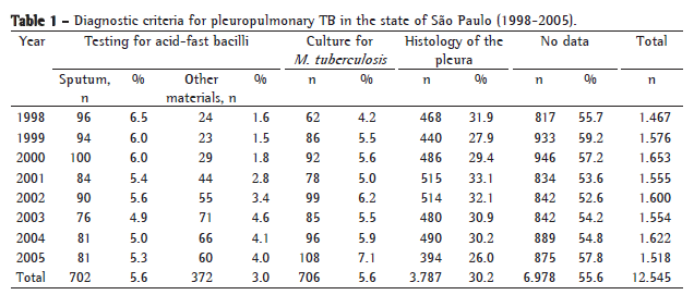 In the absence of a bacteriological or a histological criterion, the diagnosis is registered only as "other forms of diagnosis" in the Epi-TB database of the state of São Paulo. This fact limits the study. However, we believe that the implementation of a new epidemiological surveillance TB system (Web-TB on the Internet) in the state of São Paulo can correct this problem. We also suggest that information be systematized and detailed, including other diagnostic methods, especially molecular biology studies or biochemical and cytological analyses.