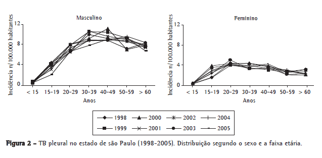 No Brasil, o maior contingente de casos de TB (20%) encontra-se no estado de São Paulo, sendo escassas as informações do perfil epidemiológico das várias expressões clínicas da TB. Dentre as formas extrapulmonares, que representam 15% do total de casos no Brasil, se destaca a TB pleural.(2-4) Entretanto, quando da existência de coinfecção TB/HIV, a proporção de casos extrapulmonares atinge 20%.(5,6)