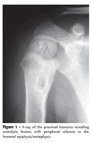 A 21-month-old boy, born in São Paulo, presented with fever and mild functional impairment of the right upper limb. The child had daily episodes of fever (> 38°C), predominantly at night. One week prior, the child had started presenting pain upon palpation and upon movement, as well as limited movement of the right arm. The mother stated that the boy had no history of local trauma. An X-ray of the right upper limb revealed a lytic lesion of the proximal epiphysis/metaphysis, with ill-defined borders, surrounded by a halo of reactive bone sclerosis, periosteal reaction and soft tissue edema (Figure 1). Magnetic resonance imaging revealed areas of abnormal marrow signal and soft tissue edema with highlighting of the infected marrow by the contrast medium-signs consistent with osteomyelitis of the proximal humerus (Figure 2). The patient received cephalosporin for 10 days in an outpatient setting. On day 8 of the antibiotic therapy, the child came to our facility due to fever and persistent pain.