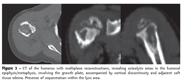 Complementary examinations revealed the following: leukocytes, 8,200 (9% rods and 66% neutrophils); erythrocyte sedimentation rate, 32 mm/h; C-reactive protein, < 6.0 mg/L; normal urine sediment; normal chest X-ray; and strongly positive PPD result, 18 mm. A CT scan of the humerus revealed multiple lytic lesions in the proximal region of the humerus, involving the epiphysis, the metaphysis and the proximal diaphysis, as well as cortical discontinuity and adjacent soft tissue edema (Figure 3).