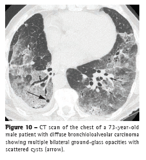 Diffuse patternThe diffuse form of BAC represents a multifocal origin, endobronchial dissemination, hematogenous metastases, or any combination of these patterns. Consolidation, nodules (Figure 9), ground-glass opacities, air bronchograms, and cysts (Figure 10), as well as peripheral distribution and distribution in the lower lobes, characterize this pattern.(20) Satellite lesions can be seen in BAC and in pneumonia.(18)