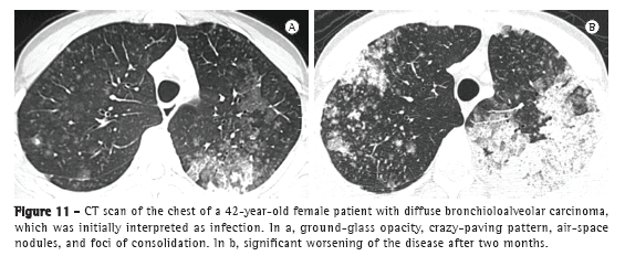 Ground-glass opacities associated with septal thickening ("crazy-paving pattern") are also described in the diffuse form of BAC (Figure 11). The differential diagnosis should include other, benign, conditions, such as alveolar proteinosis,(18) hemorrhage, and infection.