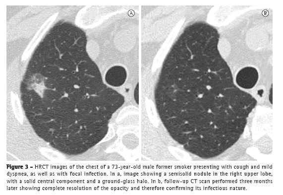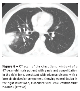 Final considerationsBoth BAC and adenocarcinoma with a bronchioloalveolar component have a wide spectrum of CT patterns, such as solitary nodules or masses, ground-glass opacities, consolidation, and diffuse presentation. Knowledge of the major imaging findings in these neoplasms is of utmost importance, especially for establishing an early diagnosis and differentiating such tumors from infectious pulmonary processes. Focal opacities, parenchymal consolidations that resolve slowly or show no significant change after treatment, or a combination of the two should raise the suspicion of BAC or adenocarcinoma with a bronchioloalveolar component. In such situations, further diagnostic investigation is recommended in order to exclude lung neoplasms. For differential diagnosis or neoplasm staging, PET can be used. However, it should be emphasized that the method can yield false-negative and false-positive results, a careful analysis of the CT findings being therefore required in all cases.