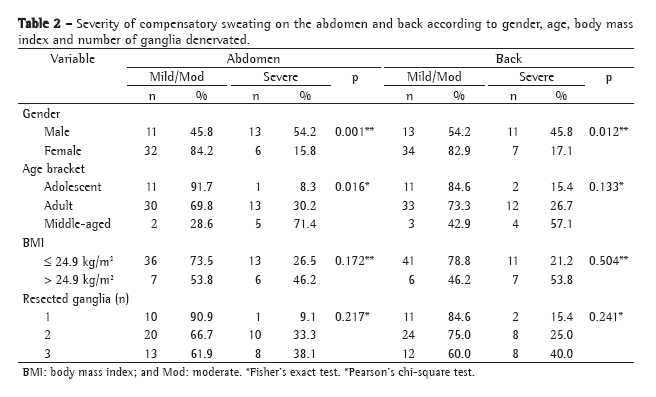 The severity of compensatory sweating depended on the area affected (abdomen, back or legs). Of the 80 patients evaluated, only 12 (15.0%) presented no compensatory sweating, 4 (5.0%) presented compensatory sweating at one site, and 64 (80.0%) presented compensatory sweating at two or more sites. Severe compensatory sweating occurred on the abdomen and the back, respectively, in 19 (23.8%) and 18 (22.5%) of the patients (Figure 1). However, only 7 (3.8%) presented compensatory sweating on the legs. The severity of compensatory sweating on the abdomen and back was analyzed according to gender, age, BMI and number of ganglia denervated (Table 2). Among the 11 adolescent patients who presented compensatory sweating, abdominal sweating was severe in only 1 (8.3%), compared with 13 (30.2%) of the adult patients and 5 (71.4%) of the middle-aged patients (p = 0.016). In addition, the proportion of patients reporting compensatory sweating on the abdomen was greater among males than among females (54.2% vs. 15.8%; p = 0.001). Of the 7 patients with a BMI > 24.9 kg/m2, 4 (53.8%) presented compensatory sweating on the back, a significantly higher proportion than that observed for the patients a BMI ≤ 24.9 kg/m2 (p = 0.018). The proportion of patients reporting compensatory sweating on the back was also greater among males than among females (45.8% vs. 17.1%; p = 0.012).