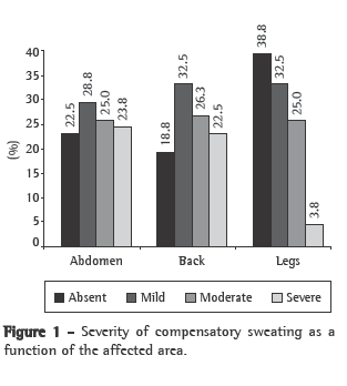 The body area affected by compensatory sweating is another important point. In a recent study it was reported that the areas most often affected by compensatory sweating were the chest, back, legs, abdomen, thighs and groin.(1) In fact, the most common locations for compensatory sweating described in the literature, and corroborated in our study, are the abdomen, back, feet and buttocks.(18,19) The present study also addressed the relationship between the severity of compensatory sweating and the affected area, as well as the roles played by age, gender and BMI. It was found that compensatory sweating on the chest was generally mild for adolescents and young adults, whereas it was generally severe for middle-aged patients. On the chest and on the back, compensatory sweating was generally mild or moderate in women.