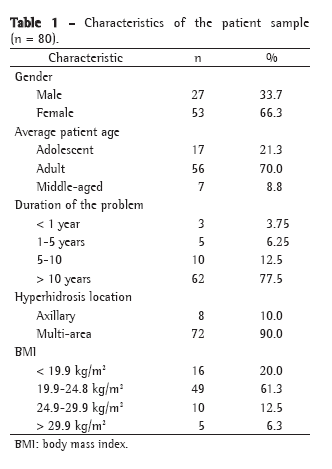 Demographic and pre-operative characteristics of the patients are shown in Table 1. Of the 80 patients included in the sample, 27 (33.7%) were male and 53 (66.3%) were female. The mean age at the time of surgery was 26.83 ± 10.17 years (range, 12-56 years). We collected data related to the duration of the problem, the area(s) affected, precipitating factors, body mass index (BMI) and surgical details, as well as post-operative complications and outcomes. Patient satisfaction with the results was evaluated through the use of a 10-point rating scale based on patient perception (Appendix 1).(11) The degree of sweating in the various areas affected (abdomen, back and legs) was scored pre-operatively and post-operatively. Patients completed the scale without any intervention or advice from the interviewer. Post-operative compensatory sweating was graded as follows: 1-4 = mild; 5-7 = moderate; and 8-10 = severe. A score of 10 was indicative of the most severely affected area, and the other scores were given accordingly. Finally, patients were asked whether they were satisfied with the outcome of the procedure. Patients were evaluated and completed the scale on post-operative day 13, in the sixth post-operative month and at one year after the procedure.