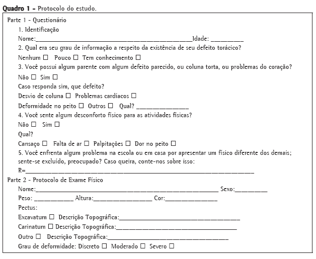 O perfil físico do portador de uma deformidade pectus e dos alunos considerados normais foi traçado por intermédio da verificação das variáveis antropométricas de peso e altura, com o uso de uma balança com medidor de altura (Filizola S.A., São Paulo, Brasil). O exame físico de cada aluno foi direcionado para a detecção de deformidades da parede torácica por meio da inspeção do tórax.