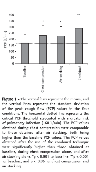 The present study has certain limitations. The findings might have been influenced by the spirometry technique, by the sequence in which PCF was measured, and by the respiratory therapist. In patients with neuromuscular disease, spirometry is subject to various problems. In such patients, common problems include air leaks around the mouthpiece, fatigue during the maneuvers, and short expiratory time. Therefore, we used standard spirometry criteria.(6) In addition, since the patients we unable to exhale for the requisite 6 s, we accepted curves with expiratory plateaus of ≥ 2 s.(8) In the cases in which there were air leaks around the mouthpiece, we used an oronasal mask.(23) To prevent the sequence of the assisted cough maneuvers from influencing the results, we randomly alternated that sequence. Air stacking was always performed by the same respiratory therapist, and the majority of the patients had already been using air stacking at least three times per day at home. Therefore, we do not believe that the data were adversely affected by any inappropriate application of the technique. Although similar studies have been conducted by other authors,(4,12) the data obtained in the present study have internal validity for application in Brazil, where the level of education and socioeconomic status of the patients are lower than in developed countries.