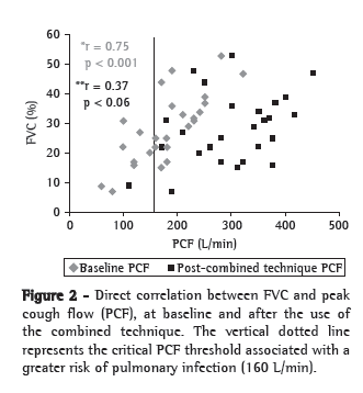 As was expected, PCF fell in proportion to the age-dependent drop in FVC, as has been reported by other authors.(21) The correlation between FVC and the PCF after the use of the combined technique was weak, suggesting that there are other factors that influence maximum insufflation capacity and chest compression. Respiratory system compliance differed among the subjects studied; In addition, kyphoscoliosis can impede the performance of assisted cough maneuvers.(22) In the present study, there were no differences between the patients with and without kyphoscoliosis in terms of the increase in PCF. However, since the patient sample was small, there is a chance that this was a type II error.