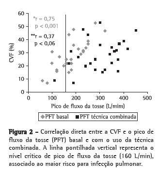 DiscussãoNeste estudo, descrevemos que, em adolescentes portadores de DMD e distúrbio ventilatório restritivo grave, a assistência à tosse através do empilhamento de ar e/ou da compressão torácica aumentou a eficiência da tosse. É na segunda década de vida, quando há evolução para cifoescoliose e/ou restrição pulmonar, que esses adolescentes apresentam episódios de insuficiência respiratória potencializadas pelo acúmulo de secreção traqueobrônquica. Durante os episódios de infecção pulmonar, porém, é fundamental uma estratégia terapêutica adequada que auxilie os músculos expiratórios. O tratamento inicial da insuficiência respiratória aguda em indivíduos normais inclui a suplementação de oxigênio; porém, em pacientes com doença neuromuscular, há maior risco de retenção de gás carbônico e não há benefício do uso da oxigenoterapia.(11) Ainda, a oxigenoterapia não permite que a saturação da oxi-hemoglobina seja um alarme do acúmulo de secreção, momento em que os familiares e os profissionais de saúde devem realizar as medidas de limpeza da secreção pulmonar. Como observamos neste estudo, o uso da técnica combinada teve maior eficácia do que cada técnica isoladamente. Para todos os pacientes, foi possível realizar um incremento do PFT, sendo que, para 7 dos 8 pacientes que apresentavam PFT < 160 L/min, foi possível superar esses níveis. Esse é um achado importante, pois esse é o limiar conhecido como o maior fator de risco para infecções pulmonares.(3) Por isso, é importante orientar essas famílias quanto às técnicas de compressão torácica e de empilhamento de ar, além da aquisição de uma bolsa de ventilação.