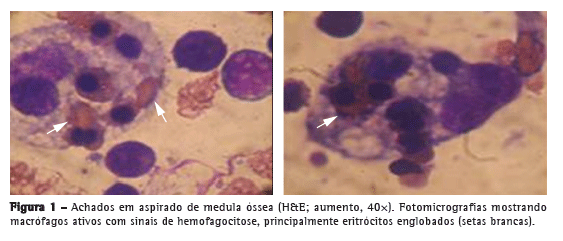 No momento da internação, foram prescritos os antibióticos ceftriaxona, amicacina e vancomicina. Novas culturas de espécimes de sangue e urina apresentaram resultados negativos. No 10º dia de internação, o paciente apresentou icterícia e tremor das mãos (flapping). Não houve alterações dignas de nota no nível de consciência ou nos parâmetros hemodinâmicos. Os resultados dos exames laboratoriais foram consideravelmente piores (Tabela 1). A TCAR de tórax não revelou nenhuma alteração, e o ecocardiograma transtorácico não apresentou nenhuma alteração digna de nota. Tanto a ultrassonografia como a TC abdominal apresentaram resultados normais. Tanto a sorologia para HIV, vírus Epstein-Barr e hepatite como os marcadores reumatológicos (anticorpos antinucleares, fator reumatoide e anticorpo anticitoplasma de neutrófilos) apresentaram resultados negativos. O exame direto do sangue revelou a presença de leucocitose (41.100 células/mm3), trombocitopenia (25.000 plaquetas/mm3) e anemia (hemoglobina: 7,2 g/dL; hematócrito: 21%; ferritina: 690,6 ng/dL e ferro sérico: 50 mg/dL). No 20º dia de internação, o paciente apresentou débito urinário reduzido, insuficiência hepática (com hepatomegalia e esplenomegalia) e insuficiência respiratória. Passou então a receber ventilação mecânica, hemodiálise e vasopressores. Quatro culturas de sangue apresentaram resultados negativos. A sorologia para erliquiose, bartonelose e febre Q apresentou resultados negativos. Repetiu-se a dosagem de ferritina (1.619 ng/dL). Solicitou-se um mielograma devido à febre inexplicável, trombocitopenia e ferritina sérica elevada; o exame mostrou fagocitose de glóbulos vermelhos por macrófagos (Figura 1). Estabeleceu-se o diagnóstico de síndrome hemofagocítica (SHF), e o paciente passou a receber pulso de metilprednisolona no departamento de hematologia, porém sem sucesso. O paciente morreu quatro dias após o início da corticoterapia.