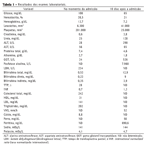 No momento da internação, o paciente estava febril (39°C) e um pouco ansioso. Não apresentava icterícia, rash ou linfadenopatia. Apresentava pressão arterial = 130/70 mmHg, FR = 21 ciclos/min, SaO2 = 96% e FC = 88 bpm. O exame cardiovascular não revelou alterações. O exame pulmonar revelou sons respiratórios normais. O exame físico não revelou nenhuma alteração digna de nota. Os resultados dos exames laboratoriais realizados no momento da internação foram semelhantes aos dos relatados anteriormente. A radiografia de tórax não apresentava alterações.