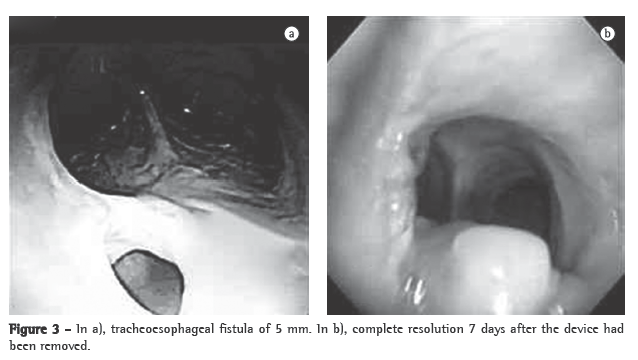 IntroductionFistulas in the tracheobronchial tree have a multifactorial etiology and present a variable incidence in the literature. The related morbidity and mortality are high. Bronchopleural fistulas usually result from surgical procedures involving pulmonary resection; the incidence of these fistulas ranges from 0 to 28%,(1,2) and the mortality rate ranges from 16 to 72%.(3) Non-neoplastic tracheoesophageal fistulas can be congenital,(4,5) iatrogenic(6) or related to thoracic trauma. Once such a fistula has been diagnosed, surgical closure is formally indicated. However, the clinical status of affected patients is usually unfavorable, which precludes the use of additional, extensive surgical interventions.