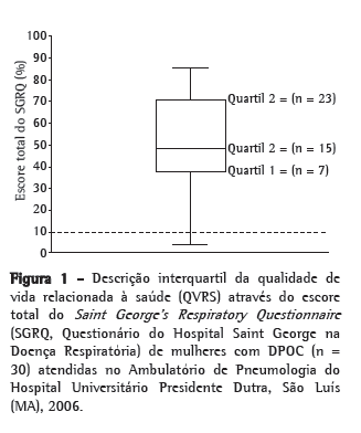 A grande maioria das mulheres entrevistadas (86,7%) apresentou comprometimento da QVRS, em graus variados, de acordo com o escore total do SGRQ (%). Valores acima de 10% indicam alguma alteração da QV. Quanto maior o somatório do SGRQ, pior é a QVRS. Na Figura 1, observa-se que 7 mulheres encontram-se no primeiro quartil, com escore do SGRQ de 36,37%, sendo que deste total apenas 4 apresentaram percentual igual ou inferior a 10%. No segundo quartil foram 15 mulheres, com escore de 48,20%, e no terceiro quartil foram 23 mulheres, com escore de 70,46%.