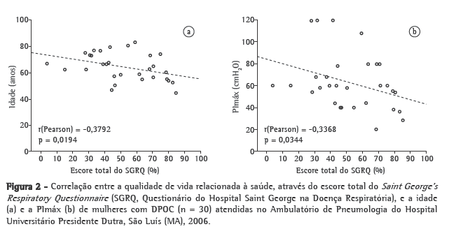 No entanto, quanto pior foi a QVRS das pacientes avaliadas, pior foi o resultado da capacidade funcional, medida pelo TC6, e pior a força inspiratória (PImáx), ou seja, quanto menor à distância percorrida no TC6, maior o somatório das respostas do questionário do SGRQ e, portanto, pior a QVRS. Em um estudo similar,(25) houve correlação negativa do TC6 com os domínios atividades e impacto, apontada como um reflexo de limitada atividade funcional e física dos pacientes pesquisados. Em outro estudo,(23) os autores também demonstraram correlações negativas entre o teste de caminhada de 12 minutos e os domínios atividades e impacto, confirmadas por regressão múltipla. A baixa capacidade ao exercício e a dispneia constituem fatores etiológicos, diferentes dos tradicionais, que resultam em comprometimento da QVRS de pacientes com DPOC.(23)