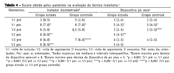 No grupo controle, as medianas obtidas pelo escore da técnica de uso de pó seco na V1 foram, respectivamente, 3,0 e 5,0, após as orientações e correções (p < 0,001). As medianas obtidas em V2 e em V3 foram, respectivamente, 3,0 (p < 0,001) e 4,0. Dessa forma, os pacientes do grupo controle apresentaram um incremento no escores da técnica inalatória em V1 e um pequeno, mas significante declínio, com escore insatisfatório em V2.