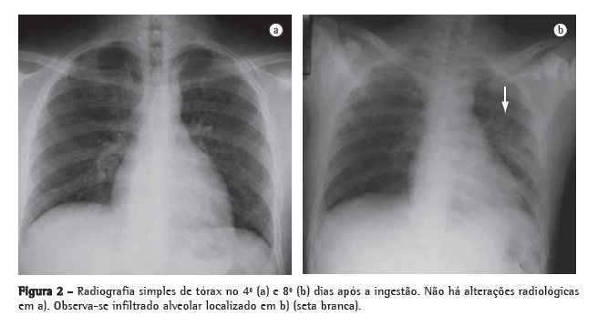 No segundo dia de internação (6º dia após a ingestão), o paciente apresentou hemoptise. A radiografia de tórax realizada no 8º dia após a ingestão mostrou infiltrado alveolar localizado (Figura 2b). Opacidades pulmonares, pneumomediastino, pneumotórax e enfisema subcutâneo foram detectados na TC de tórax (Figura 3). No sétimo dia de internação, os parâmetros gasométricos pioraram (Figura 1), e o paciente foi submetido a um segundo ciclo da mesma terapia imunossupressora. Posterior­mente, apesar de um episódio de neutropenia febril, ele se recuperou gradualmente e recebeu alta hospitalar, em bom estado, após quatro semanas, sem necessidade de oxigenoterapia domiciliar. Após quatro meses, o paciente estava trabalhando novamente e não tinha queixas, a não ser por dispneia após esforço físico intenso. Na ausculta torácica, ainda se podiam ouvir crepitações nos campos pulmonares inferiores, e havia sibilância universalmente distribuída, juntamente com atrito pleural no hemitórax direito. A TC de tórax realizada quarto meses após a alta também é mostrada na Figura 3.
