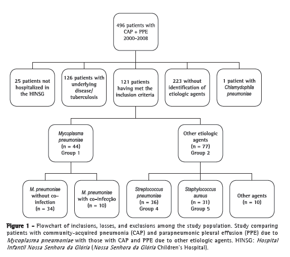 Between 2000 and 2008, 496 patients with CAP/PPE were admitted to the HINSG. After having applied the exclusion criteria, we initially evaluated 345 children and adolescents hospitalized for CAP/PPE; of those, 121 were included in the study on the basis of the etiologic agent, which was identified as typical bacteria or M. pneumonia, no other atypical bacteria having been isolated and identified as the sole etiologic agents (Figure 1).