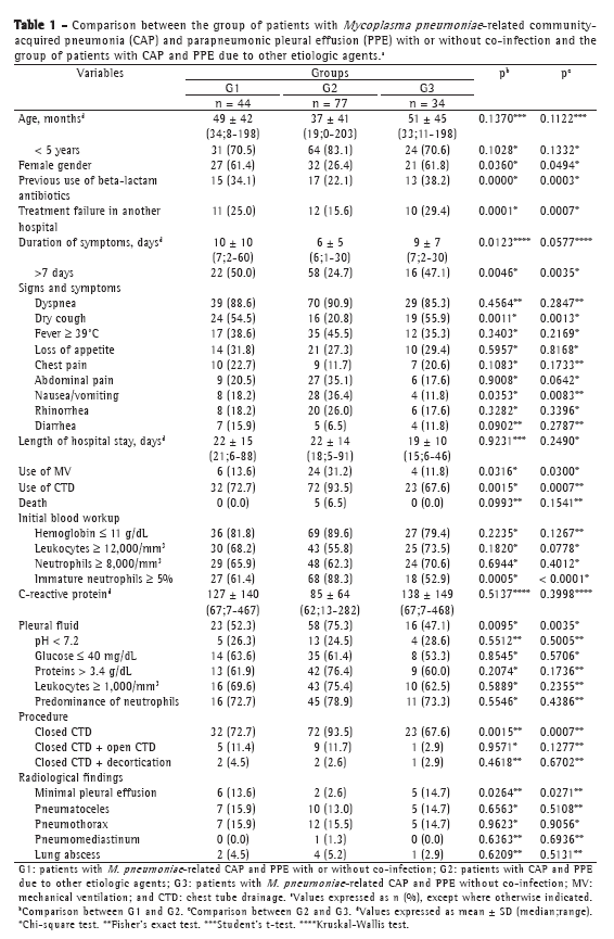 The diagnosis of M. pneumoniae-related pneumonia was based on the finding of M. pneumoniae-positive IgM in peripheral blood by ELISA. The kit used (ImmunoWELL; GenBio, San Diego, CA, USA) has a specificity of 90% and a sensitivity of 92% (IgM in the acute phase), when compared with PCR.(10) The diagnosis of pneumonia due to typical bacteria was based on positive blood culture results or isolation of the pathogens from pleural fluid.