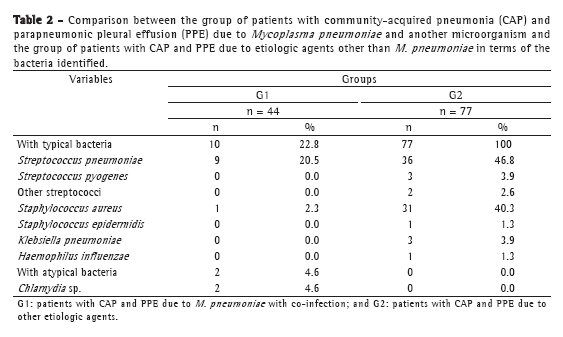 We found no statistically significant differences between group 1 patients (with M. pneumoniae) and group 2 patients (with other etiologic agents) in terms of age. The number of patients younger than 5 years of age was found to be 31 (70.5%) in group 1 and 64 (83.1%) in group 2. The mean age was found to be 4.1 years in group 1 and 3.1 years in group 2. Regarding gender, 27 (61.4%) of the patients in group 1 were female, as were 32 (41.6%) of those in group 2, the difference being statistically significant (p = 0.03). Previous use of beta-lactam antibiotics and the need for being transferred to our facility because of treatment failure were more common in group 1 (p < 0.01 for both). In comparison with group 2, group 1 showed longer duration of symptoms prior to admission, higher frequency of dry cough, and lower frequency of nausea or vomiting (p < 0.01; p < 0.01; and p = 0.03, respectively). In contrast, the use of mechanical ventilation and chest tube drainage during hospitalization was more common in group 2 (p = 0.03 and p < 0.01, respectively). Deaths occurred only in group 2, 5 patients having died. Regarding ancillary tests, blood workup showed a predominance of immature neutrophils in group 2 (p < 0.01). In contrast, there were no statistically significant differences between the two groups in terms of C-reactive protein levels or biochemical parameters of pleural fluid. The chest X-ray finding of minimal pleural effusion (PPE < 10 mm) was more common in group 1 (p = 0.02; Table 1). In 12 of the patients in group 1, we found co-infection with other bacteria, the most common being S. pneumoniae, in 9 patients (20.5%). In group 2, S. pneumoniae was the most common etiologic agent, having been found in 36 patients (46.8%), followed by S. aureus, in 31 (40.3%; Table 2).