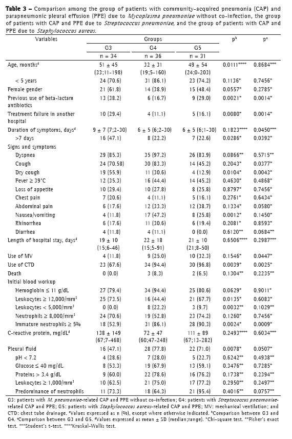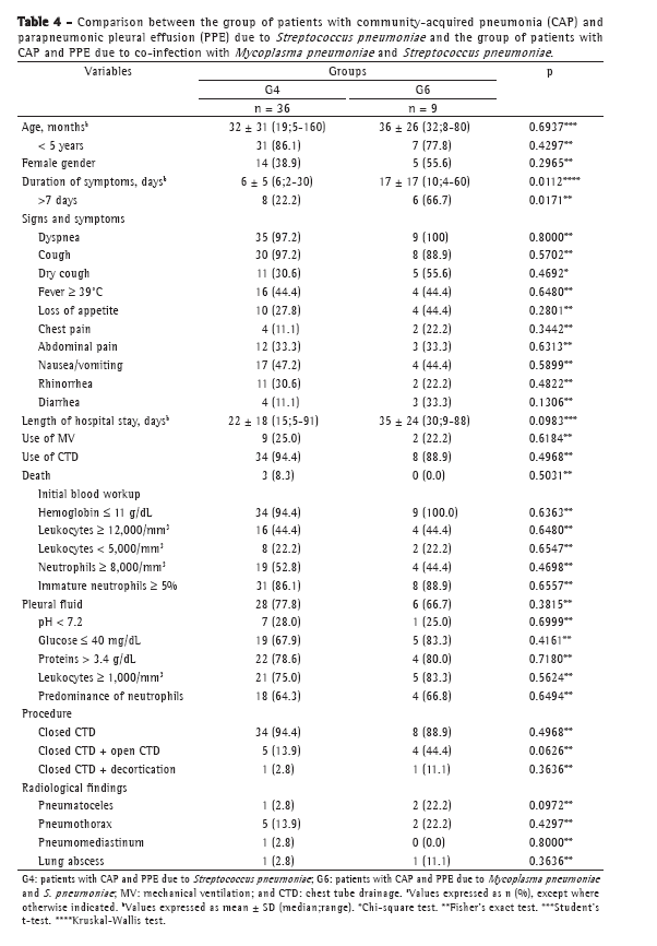 When we compared the patients in group 3 with those in group 4 (S. pneumoniae), we found that the mean age was 4.25 years in the former and 2.58 years in the latter (p = 0.01). Previous use of beta-lactam antibiotics prior to hospitalization and the need for being transferred to our facility because of treatment failure were more common in group 3 (p < 0.01 for both). In comparison with group 4, group 3 showed longer duration of symptoms prior to admission, higher frequency of dry cough, and lower frequency of nausea or vomiting (p = 0.02; p = 0.01; and p < 0.01, respectively). Leukocytosis was more common in group 3 (p = 0.01), whereas immature neutrophils were more common in group 4 (p < 0.01). There were no significant differences between the two groups in terms of C-reactive protein levels. Closed chest tube drainage was performed more frequently in group 4 (p < 0.01). Although open chest tube drainage was also more common in that group, the difference was not statistically significant. We found no statistically significant differences between the two groups in terms of radiological and extrapulmonary changes (Table 3).