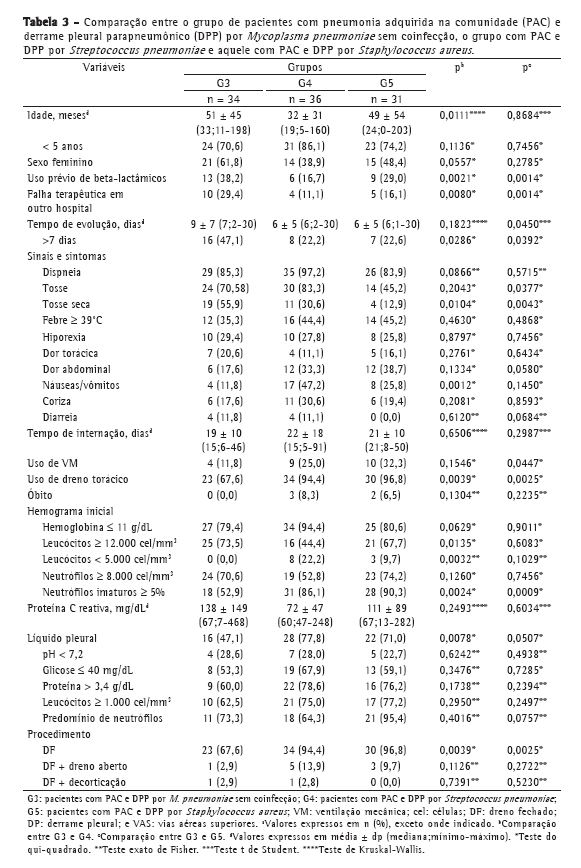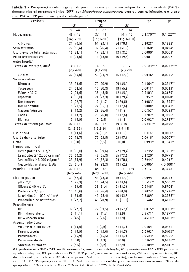 Na comparação entre os pacientes do G3 (M. pneumoniae sem coinfecção) com os do G2, a retirada dos 10 casos de coinfecção com bactérias típicas do G1 praticamente não alterou as variáveis com diferenças estatisticamente significativas (Tabela 1).