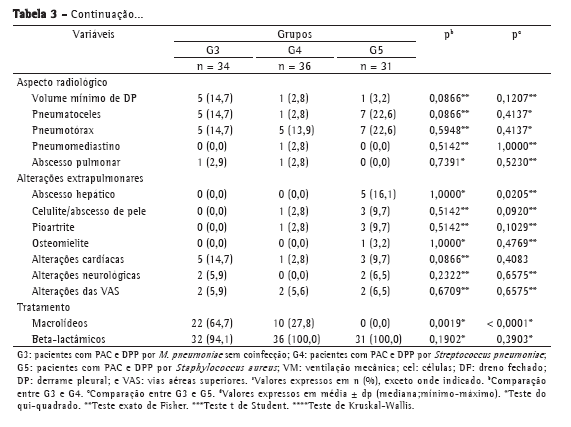 Já na comparação entre os pacientes do G3 com os do G4 (S. pneumoniae), a média de idade foi de 4,25 anos e 2,58 anos, respectivamente (p = 0,01). O uso prévio de beta-lactâmicos antes da internação e a presença de pacientes encaminhados de outros serviços por falência terapêutica foram mais frequentes no G3 (p < 0,01 para ambos). Também no G3, houve maior duração dos sintomas até a admissão, maior frequência de tosse seca e menor frequência de náuseas ou vômitos (p = 0,02; p = 0,01; e p < 0,01, respectivamente). No hemograma, leucocitose foi mais comum no G3 (p = 0,01), enquanto neutrófilos imaturos foram mais comuns no G4 (p < 0,01). Não houve diferença significativa nos resultados de proteína C reativa entre os dois grupos. Entre os procedimentos, o dreno torácico fechado foi mais frequentemente utilizado no G4 (p < 0,01), bem como o uso de dreno aberto, mas esse sem diferença estatisticamente significativa. A comparação das alterações radiológicas e extrapulmonares também não apresentaram diferenças estatisticamente significativas entre esses grupos (Tabela 3).