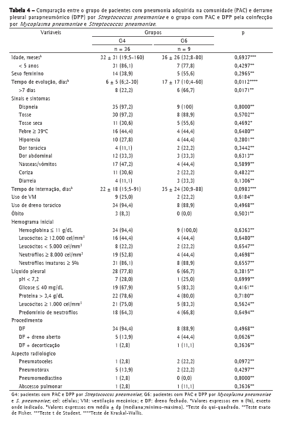 Na comparação entre os pacientes do G6 (coinfecção de M. pneumoniae e S. pneumoniae) e o G4, a média de idade foi de 3,0 anos e de 2,5 anos, sem diferença significativa. A coinfecção M. pneumoniae e S. pneumoniae prolongou a duração dos sintomas até a admissão, que foi, em média, de 17 dias e 6 dias no G6 e G4, respectivamente (p = 0,01; Tabela 4).