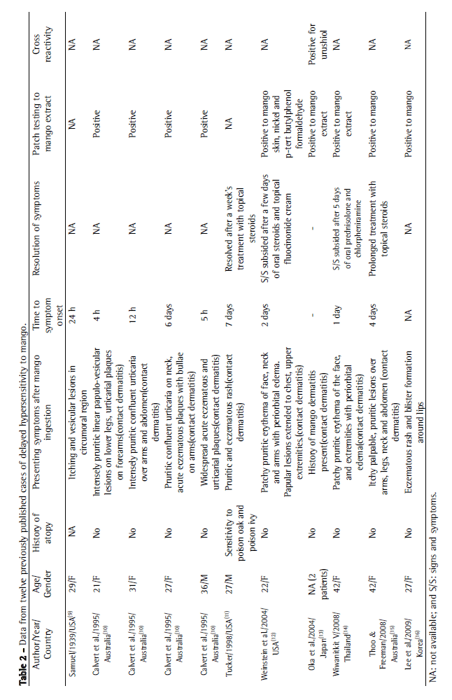 As can be seen in Table 2, urticaria was present in eight of the twelve reported cases of delayed hypersensitivity reaction to mango,(9-12,14) whereas periorbital edema was present in two.(12,14) Three of those twelve patients developed the symptoms after ingesting mango,(9,12,14)