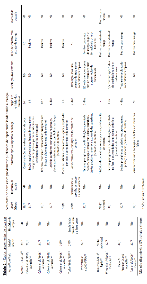 Como se pode observar na Tabela 2, urticária esteve presente em oito dos doze casos relatados de reação de hipersensibilidade tardia a manga,(9-12,14) ao passo que edema periorbital esteve presente em dois.(12,14) Três dos doze pacientes apresentaram os sintomas após ingerir manga,(9,12,14) ao passo que os outros nove apresentaram a reação após o contato com a casca da manga ou com a casca da mangueira.(10,11,13,15,16) O teste de contato foi realizado em dez pacientes,(10,12-16) e o resultado foi positivo nos dez. Não foram relatadas reatividade cruzada e positividade para anticorpos IgE específicos contra o antígeno da manga em nenhum dos pacientes.