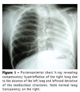 Pulmonary agenesis is a rare congenital anomaly, consisting of complete absence of the lung parenchyma, bronchi, and pulmonary vessels.(1-4) The cause is unknown. In 50% of cases, especially in cases of right lung agenesis, cardiovascular, musculoskeletal, gastrointestinal, and renal malformations are also present.(3,5-7) The prognosis is better in cases of left lung agenesis and when there are no cardiac malformations.(3) Herein, we report the clinical case of a boy with left lung agenesis, without any other congenital malformations.
