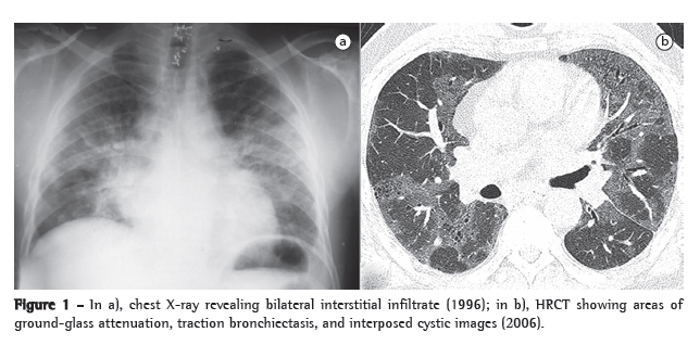 The treatment depends on the stage of the disease. In the acute and subacute phases, in which patients have symptoms similar to those of asthma and hypersensitivity pneumonia, the management includes avoiding future exposure, by means of leaves from work, together with the use of bronchodilators and inhaled corticosteroids. As the fibrotic process begins, systemic corticosteroids can be used.(2) The complete resolution of the pathological process can occur after the end of exposure and the early initiation of corticosteroid therapy.(12) In the case reported here, systemic corticosteroids and immunosuppressants were used, resulting in clinical improvement. This is the second case reported in Brazil. In 1992, the case of a 29-year-old patient exposed to hard metal dust in a metallurgical plant in Brazil was presented at the International Conference on Occupational Lung Diseases.(12)