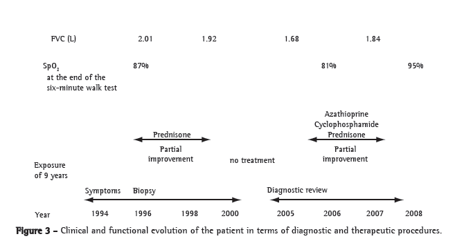 Treatment with immunosuppressants (azathioprine and pulses of cyclophosphamide) and prednisone was initiated, resulting in clinical improvement as well as in radiological and functional stability. Figure 3 summarizes the clinical and functional evolution of the patient, correlating it with the diagnostic and therapeutic procedures to which the patient was submitted over the course of his evolution.