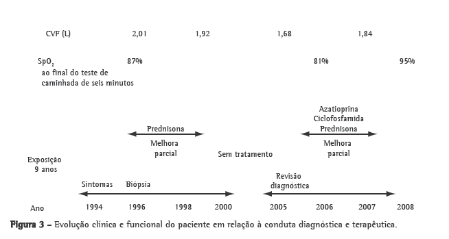 Naquela época, a radiografia de tórax solicitada por um médico da empresa revelou infiltrado pulmonar, e o paciente foi orientado a se afastar do trabalho e a procurar auxílio especializado. Com esses dados, foi lhe atribuído o diagnóstico de doença pulmonar por metal duro. Iniciou-se o uso de imunossupressores (azatioprina e pulsos com ciclofosfamida) e prednisona, com melhora clínica e estabilidade do quadro funcional e radiológico. A Figura 3 resume a evolução clínica e funcional do paciente, correlacionando-a às condutas diagnósticas e terapêuticas, às quais o paciente foi submetido ao longo de sua evolução.