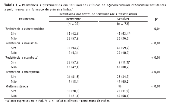 O objetivo do presente estudo foi determinar a prevalência de resistência a PZA em isolados de M. tuberculosis e identificar uma possível correlação entre resistência a PZA e resistência a outros tuberculostáticos de primeira linha. As cepas usadas no presente estudo foram isoladas no laboratório de um hospital universitário de referência em tuberculose, no Rio de Janeiro (RJ). Até onde sabemos, este é o primeiro estudo a avaliar a correlação entre resistência a PZA e resistência a outros tuberculostáticos de primeira linha no Brasil.