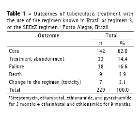 From the early 1980s until the end of 2009 in Brazil, it was recommended that cases of tuberculosis (TB) in which the use of the basic regimen, consisting of rifampin, isoniazid, and pyrazinamide-known in Brazil as regimen 1, or the RHZ regimen-resulted in treatment failure be treated with the combination of streptomycin, ethambutol, ethionamide, and pyrazinamide-known in Brazil as regimen 3, or the SEEtZ regimen.(1)