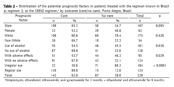 The SEEtZ regimen was established for use in cases of failure of the RHZ regimen. In general, these failures are observed in patients who do not comply with the RHZ regimen treatment. It is recognized that irregular treatment translates to higher rates of treatment abandonment, treatment failure, and death, thus lowering the cure rate.(8) In another study conducted in Porto Alegre, the authors evaluated 399 adults with active TB and treated with the RHZ regimen between 1983 and 1987. The authors reported that 18.3% used the medications irregularly, the rate of treatment failure being 7.5 times higher in the group of patients who used the medications irregularly than in the group of those who used them regularly.(5)
