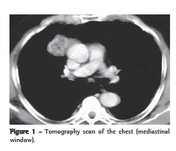 A 66-year-old male patient, born in the city of São Luiz (in the state of Maranhão) and a resident of the city of São Paulo (in the state of São Paulo), was admitted to the outpatient clinic presenting good general health status. The patient, who had no complaints, also had no history of morbidity or smoking. Radiological imaging, performed at another facility ten years prior, had revealed an anterior mediastinal tumor measuring approximately 4 cm in diameter. Therefore, we performed another round of chest X-rays and computed tomography scans of the chest. The new images revealed a tumor (3.0 × 4.0 cm) with spiculated margins, located in the right anterior mediastinum, with the same characteristics found on the scans performed previously (Figure 1). Laboratory test results and pulmonary function test results were normal. Tumors markers were normal. The syndromic diagnosis of anterior mediastinal tumor was confirmed, and surgical treatment was indicated.