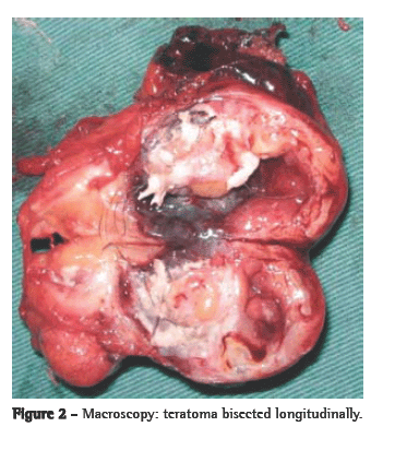 The anatomopathological examination of the surgical sample revealed a teratoma that had evolved to malignancy, defined as growth of malignant non-germ cells in a preexisting teratoma. This evolution is rare in gonads, as well as in extragonadal sites, and remains indeterminate. There are reports of its occurrence in patients submitted to chemotherapy or radiotherapy. In dermoid cysts of the ovary, evolution to malignancy is described in approximately 1-2% of cases.(3) In 1987, a case of carcinoid tumor arising within a mediastinal germ cell neoplasm was described in a patient who had been treated with chemotherapy and radiotherapy.(9)