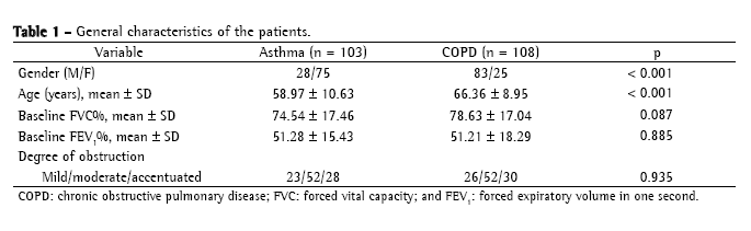 Of the 211 patients evaluated in this study, 103 (49%) had received a diagnosis of asthma, and 108 had received a diagnosis of COPD. Despite the fact that patients below the age of 40 were excluded from the analysis, mean age was higher in the COPD group Among the patients with COPD, the median smoking history was 50 pack-years (range, 15-234 pack-years). The baseline percentage FEV1 values were statistically similar in the two groups evaluated (Table 1).