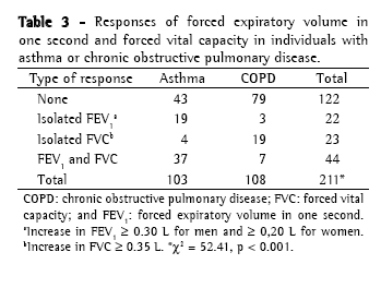 When the spirometric values were evaluated separately in accordance with the variations in FEV1, FVC or both, we found that 86% of the isolated FEV1 responses occurred in asthma patients, whereas 83% of the isolated FVC responses occurred in asthma patients (Table 3). When both responses were present, 84% of such responses occurred in asthma patients, and the difference was statistically significant (χ2 = 52.41, p < 0.001). Patients presenting isolated FVC responses had lower baseline percentage values of FEV1 than did those presenting other types of responses (39% vs. mean values > 50% in the remaining patients, F = 5.07, p = 0.002). There was a weak, yet significant, inverse correlation between prebronchodilator FVC and ΔabsFVC (rs = −0.23, p = 0.001). Among the patients with COPD, there were three cases in which the absolute variation in FEV1 was greater than 400 mL (440, 640  and 730 mL). In those three cases, the patient charts revealed emphysema on a tomography scan of the chest and a lack of clinical-spirometric improvement after treatment with inhaled corticosteroids.