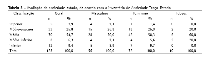 A avaliação de ansiedade-traço e ansiedade-estado foi feita apenas nos 128 fumantes que possuíam pelo menos o 2º grau completo de escolaridade, conforme requisito mínimo para aplicação do IDATE.(14) Esta classificação traduz uma avaliação qualitativa, categorizada da seguinte forma: