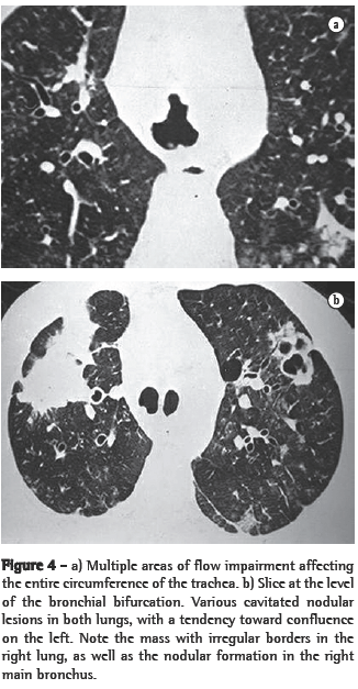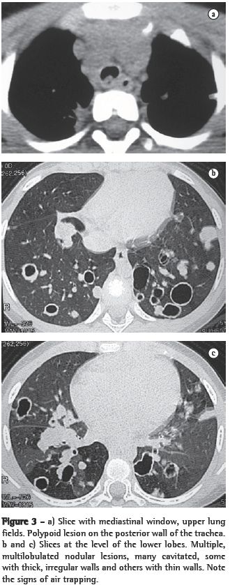 The HRCT analysis was performed by two independent observers, and discordant results were resolved by consensus. The study included the assessment of lesions in the trachea or main bronchi, as well as of accompanying parenchymal lesions.