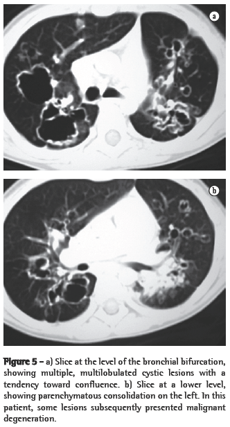 In all eight cases, the CT scans revealed polypoid formations in the trachea. In one case, injury to one of the main bronchi was identified. Seven patients presented involvement of the pulmonary parenchyma. In all eight cases, there were cavitated polypoid lesions, with irregular internal borders and walls of various thicknesses, multilobulated in six cases and presenting confluence of the lesions in five (Figures 1 through 5). Solid nodules were seen in six patients. An air-fluid level was observed in only one patient. The lesions were predominantly in the lung bases in three patients and in the middle thirds in two, whereas they were evenly distributed in two. In one patient, the lesions were accompanied by a mass, and, in another patient, they were accompanied by consolidation. In the latter case (Figure 5), there was malignant degeneration in multiple lesions. Signs of air trapping were also observed in one case. There were no identified instances of lymph node enlargement or pleural effusion.