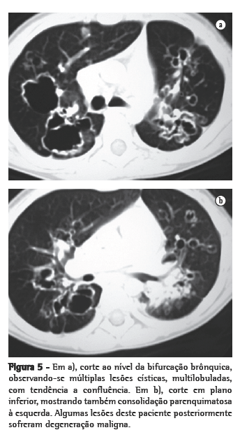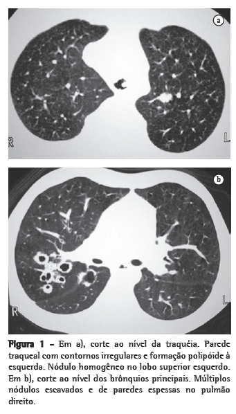 ResultadosNos 8 casos foram observadas na TC formações polipóides na traquéia. Em 1 deles, identificou-se também uma lesão em brônquio principal. Sete pacientes mostravam comprometimento do parênquima pulmonar. Em todos foram observadas lesões nodulares escavadas, com contornos internos irregulares, e paredes de espessuras variadas, com aspecto multilobulado em 6 casos, e com confluência das lesões em 5 deles (Figuras 1 a 5). Nódulos sólidos foram vistos em 6 pacientes, Em apenas 1 dos casos foram vistos níveis líquidos. As lesões predominaram nas bases em 3 pacientes, nos terços médios em 2, e em 2 não havia predomínio de distribuição. Em 1 dos pacientes, foi observada associação com massa, e em outro, com consolidação. Neste último paciente (Figura 5) foi constatada degeneração maligna em múltiplas lesões. Sinais de aprisionamento aéreo também foram observados em 1 caso. Em nenhum deles detectou-se linfonodomegalia ou derrame pleural.