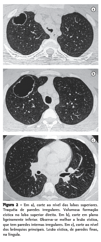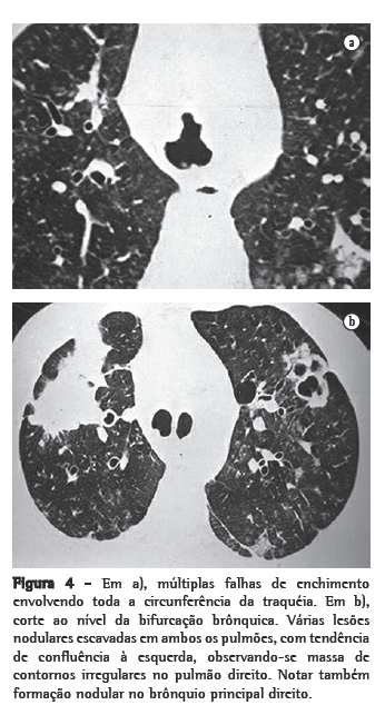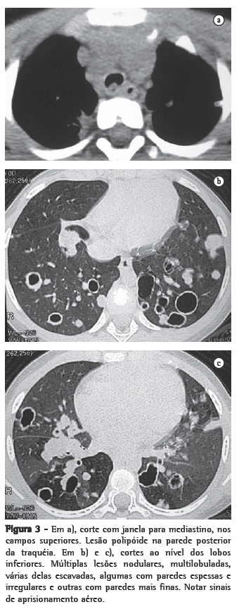 A radiografia de tórax eventualmente pode demonstrar achados sugestivos da doença, como a associação de nódulos pulmonares sólidos e/ou escavados, com lesões vegetantes nodulares na traquéia e/ou nos brônquios principais. Ao contrário dos nódulos pulmonares, que comumente são identificados na radiografia simples do tórax, os papilomas intraluminares da traquéia e brônquios em geral não são visualizados.(4) Na prática, contudo, raramente a doença é diagnosticada pela radiografia simples do tórax. Os nódulos em geral são múltiplos, bem circunscritos, de dimensões variadas, habitualmente escavados, com paredes geralmente espessas, sendo muito mais numerosos nas regiões basais e posteriores dos pulmões.(3,4) Os nódulos escavados podem conter apenas ar ou, quando infectados, nível líquido.(4)