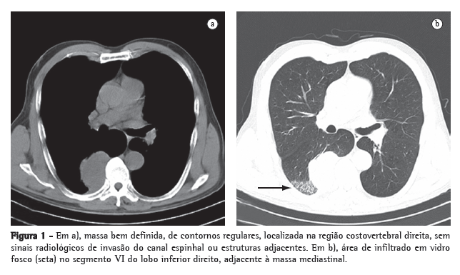 Ao exame físico apresentava-se em bom estado geral e nutricional, e seus sinais vitais eram normais. Sem adenomegalias. A ausculta pulmonar mostrava estertores finos inspiratórios em ambas as bases pulmonares. A ausculta cardíaca era normal. O exame do abdome e dos membros inferiores não revelou alterações. Os resultados do hemograma e testes bioquímicos estavam dentro dos padrões de normalidade. A tomografia computadorizada do tórax (Figura 1a) revelou massa bem definida, de contornos regulares, localizada na região costovertebral direita, medindo 6 × 4,3 cm. Adjacente a massa, observava-se infiltrado pulmonar, aparentemente inflamatório e não-específico.